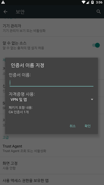 인증서 이름을 입력한 후 확인을 누르면 인증서 설치가 끝납니다. 주의할 점은 만약 디바이스 잠금(비밀번호 잠금, 패턴 잠금 등)이 설정되어 있지 않으면 인증서 설치가 불가합니다.