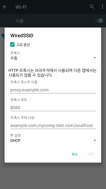 단말기 내의 설정>WIFI>네트워크 수정에 보면 고급 옵션이 존재합니다.