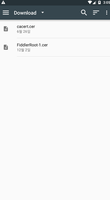 처음 다운로드할 경우 위와 같이 확장자 명이 .der로 되어 있습니다. 이것을 .cer로 고쳐주어 디바이스에 넣거나 디바이스에서 다운로드하였을 경우는 파일 관리자에서 확장자를 바꾸어 주면 됩니다.