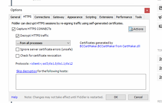 Tools>Options>HTTPS를 선택하면 Capture HTTPS CONNECTs와 Decrypt HTTPS traffic을 체크해 줍니다.