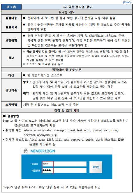 관리자 혹은 사용자의 ID/PW가 유추할 수 있는 문자열로 구성되는 경우 발생하는 취약점입니다.
