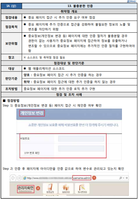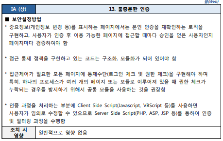 즉, 로그인과 같이 인증이 필요한 부분에 인증이 없거나 부족한 경우 불충분한 인증이라고 판단합니다.