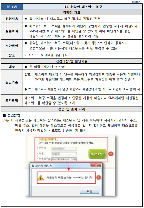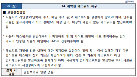 ID를 통한 PW 찾기를 할 때 임시로 생성된 PW가 취약할 경우 발생하는 취약점입니다.