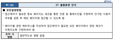 즉, 로그인과 같이 인증이 필요한 부분에 인증이 없거나 부족한 경우 불충분한 인증이라고 판단합니다.