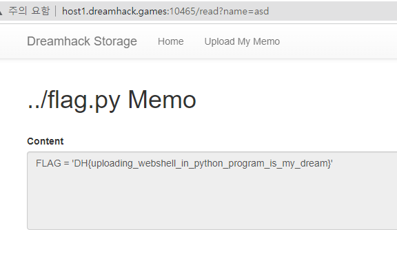 read페이지에 보안 조치가 없기 때문에 name필드를 하위 디렉터리에 접근하도록 '../flag.py'를 삽입하면 하위 디렉터리에 포함된 flag를 획득할 수 있습니다.