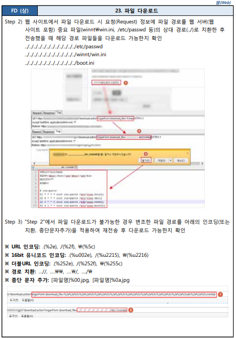 주로 /etc/passwd, /winnt/win.ini, boot.ini를 획득하여 서버 사용자 정보나 내부 정보를 획득하는 방식으로 공격합니다.