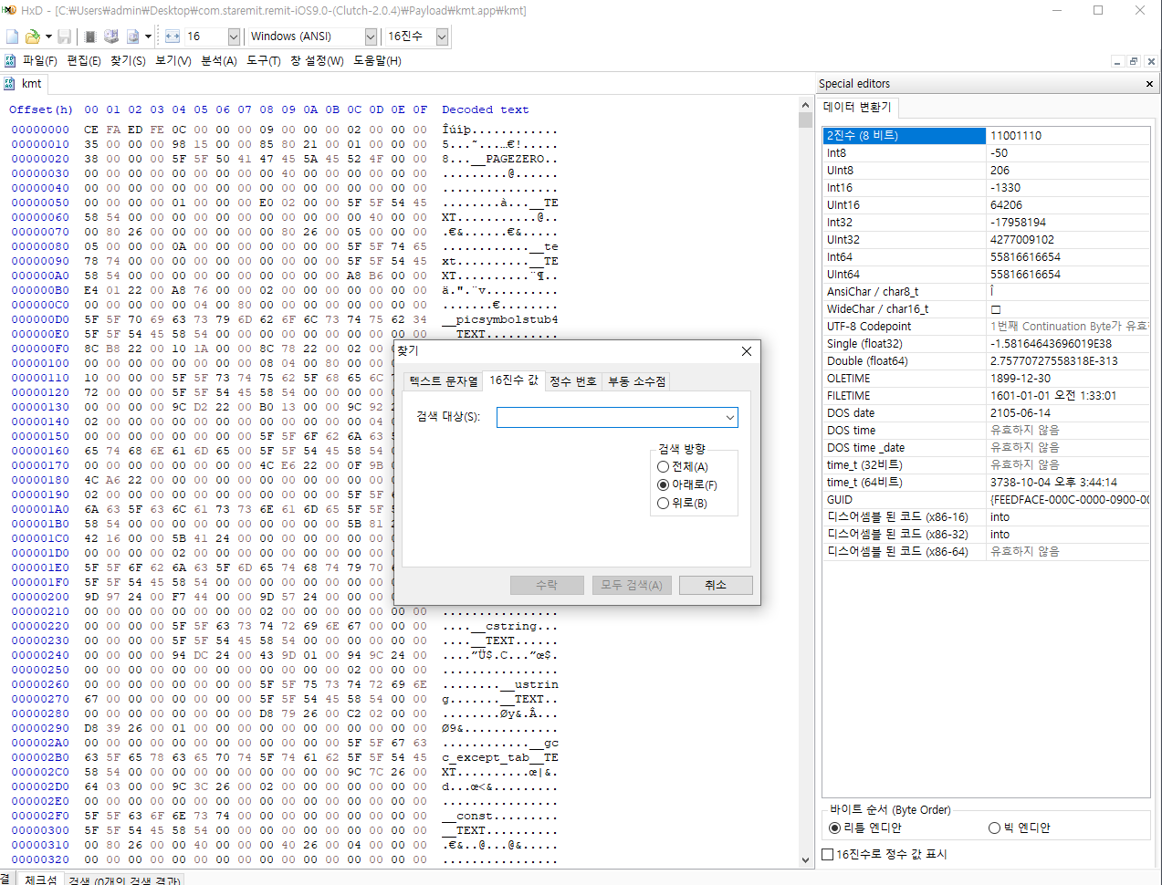 Ctrl + F를 누르면 위와 같이 뜨는데 16진수 값으로 아까 복사한 값을 넣어줌.