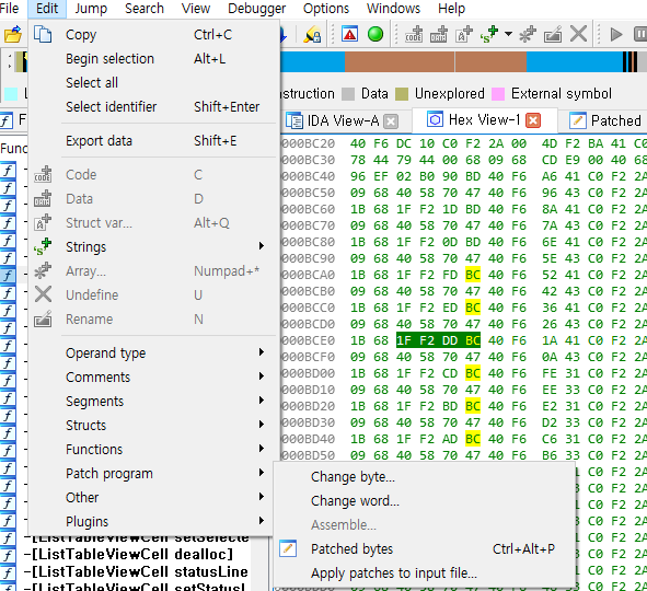 변조한 후 Edit > Patch Program > Patched bytes 여기에서 저장해도 되고