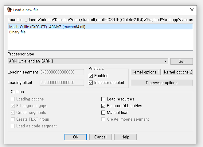 IDA에 바이너리 파일을 넣으면 처음뜨는 화면인데 아키텍처에 맞춰서 하면 되는데 ARMv7을 선택해서 진행하겠음.