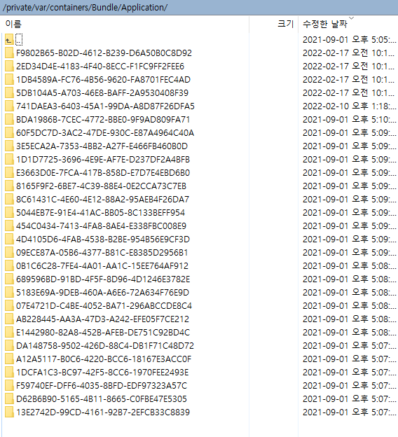 /private/var/containers/Bundle/Application <-----이 경로로 가면 설치된 앱을 확인할 수 있음.