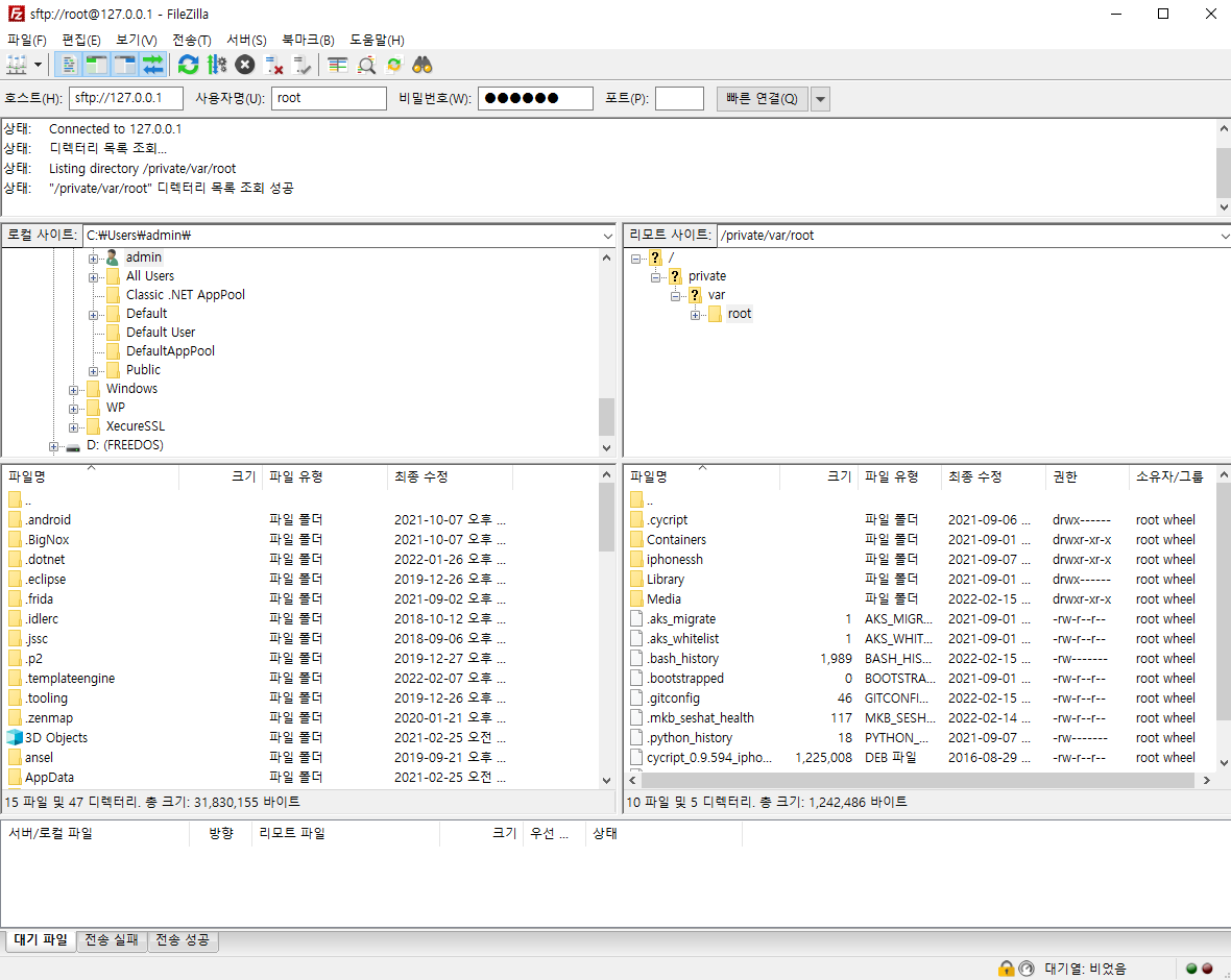 이후 SSH로 iphone에 접근.(참고 : https://rokefoke.tistory.com/37?category=844597)